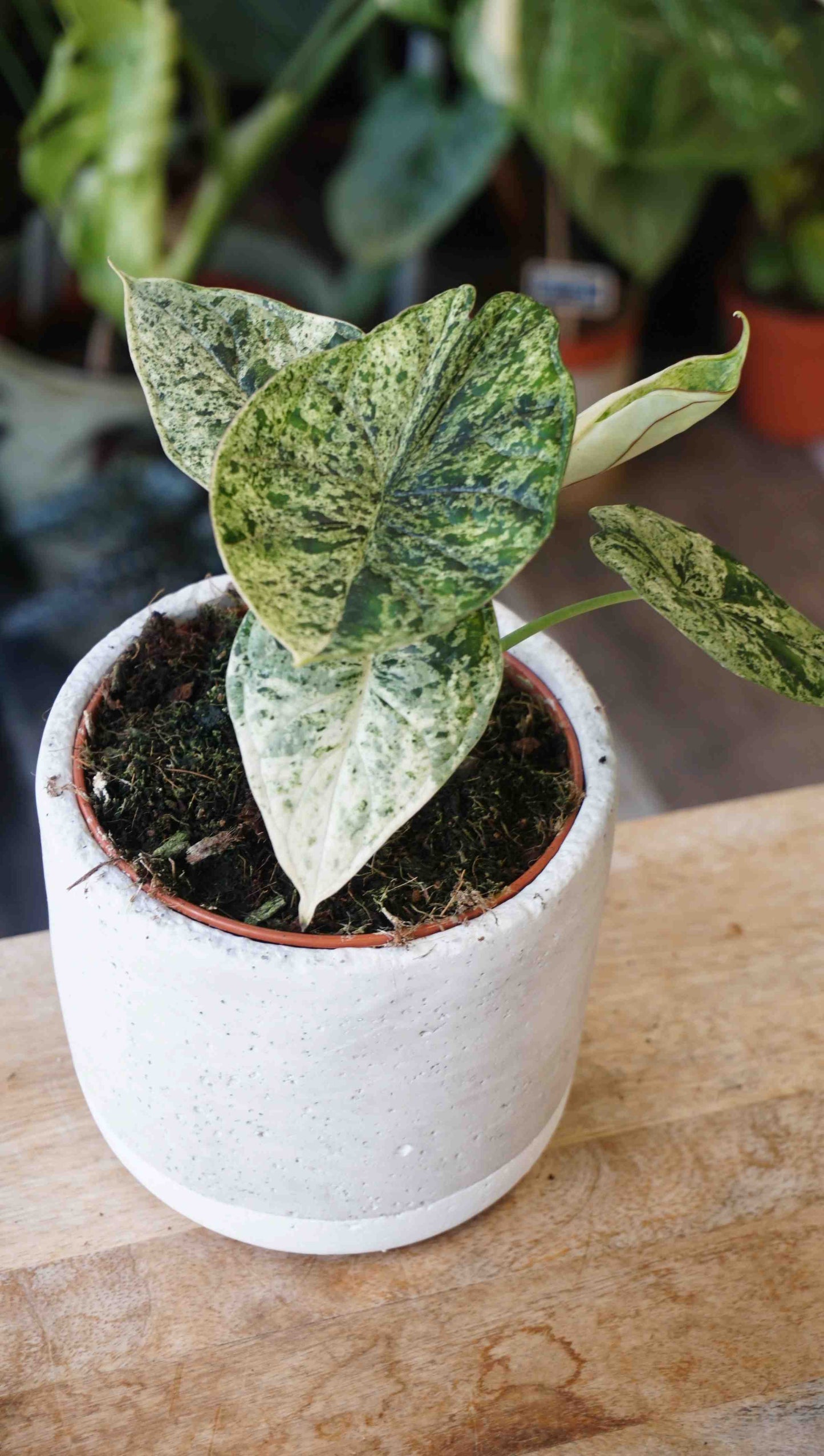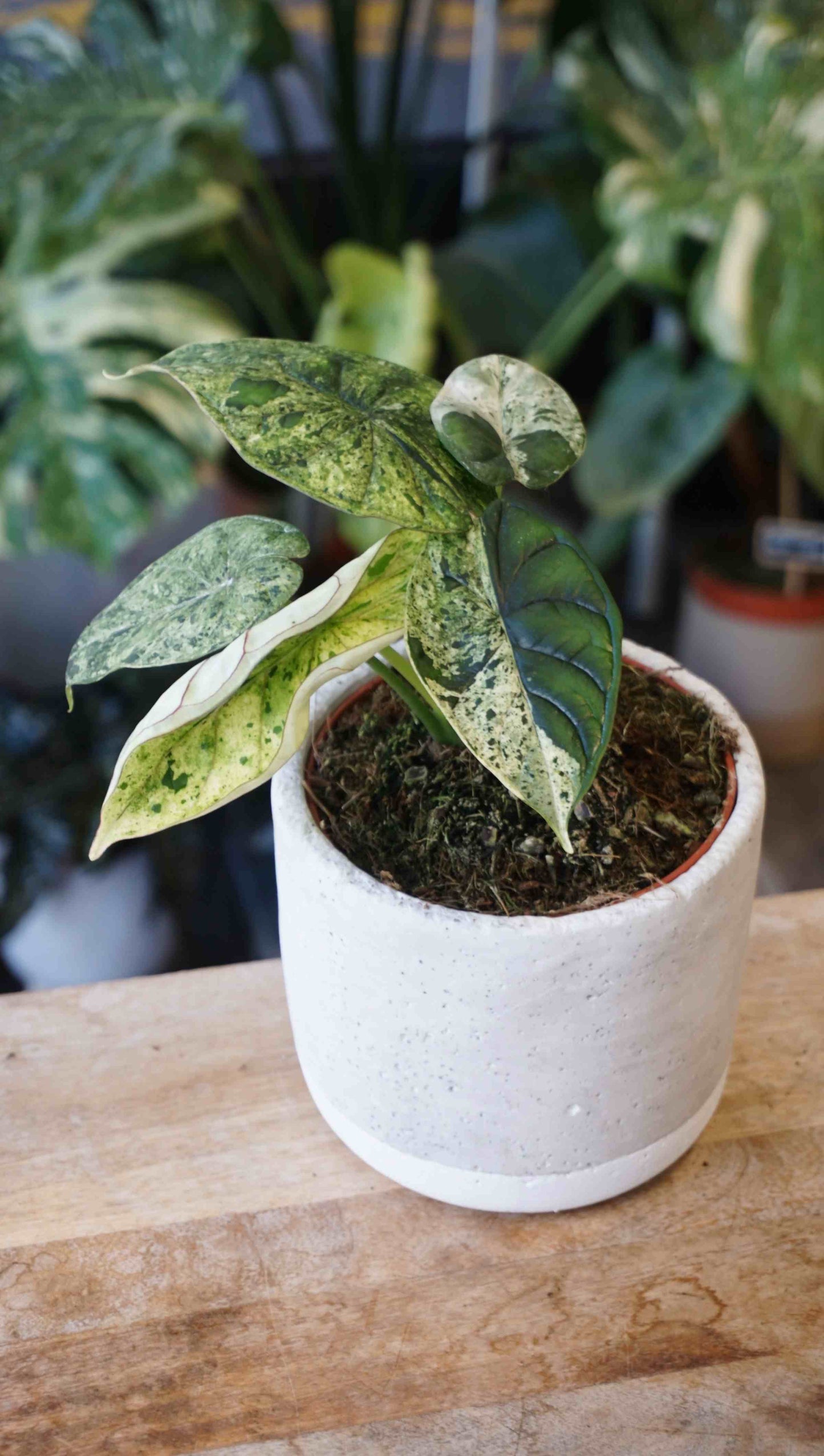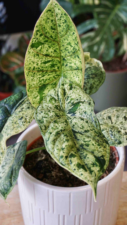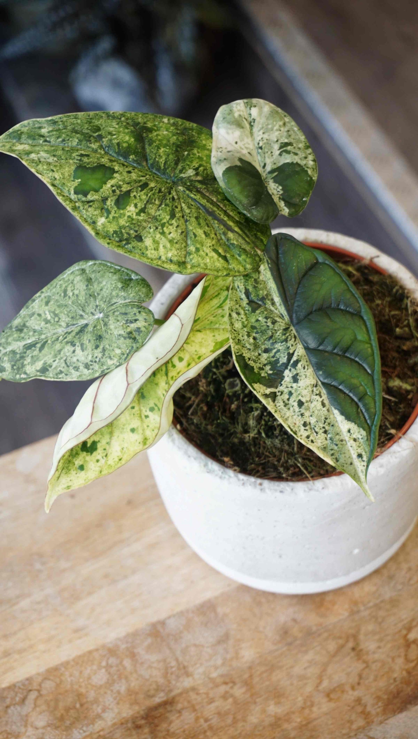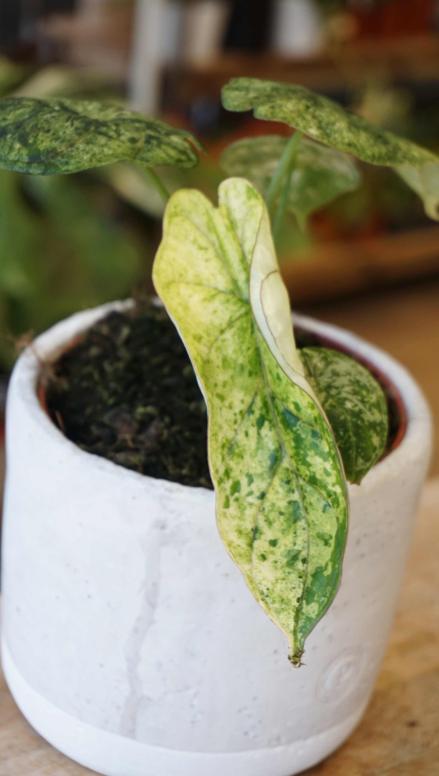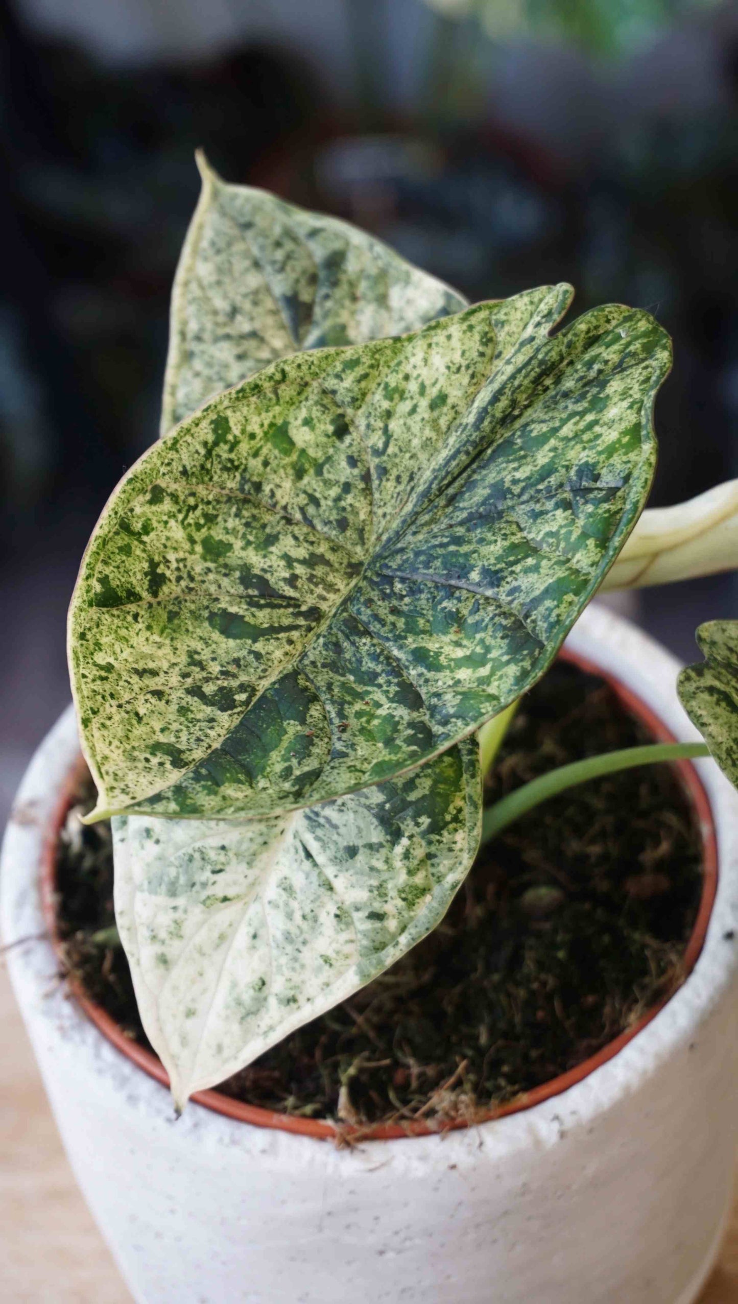 Die Alocasia Dragon Scale Mint ist eine Alocasia mit unglaublichen Blättern, sowohl wegen ihrer ikonischen Form, die an Drachenschuppen erinnert, als auch wegen ihrer zweifarbigen, panaschierten weißen Seite.