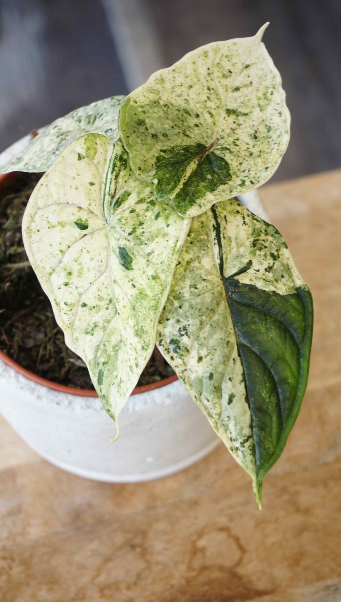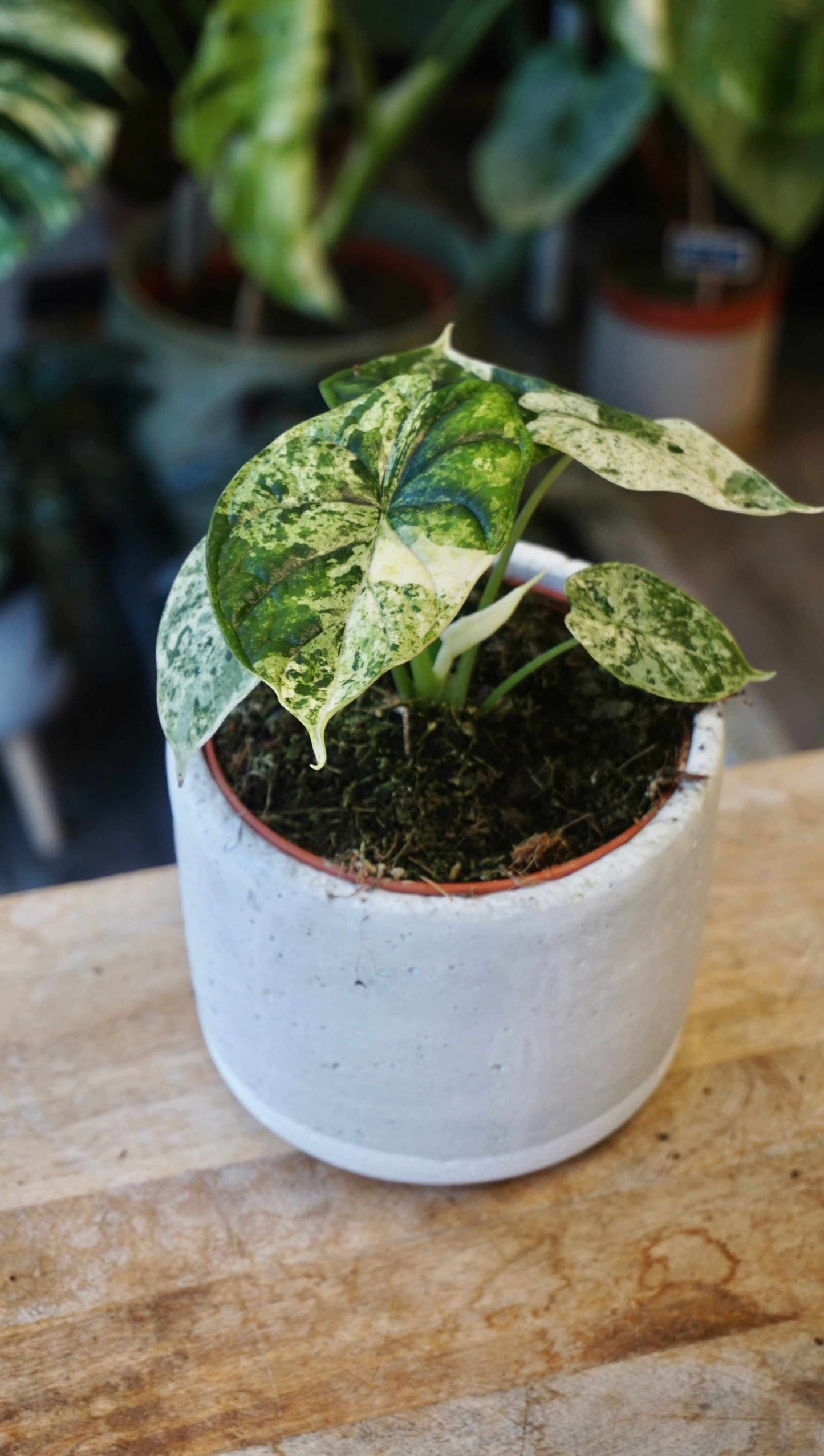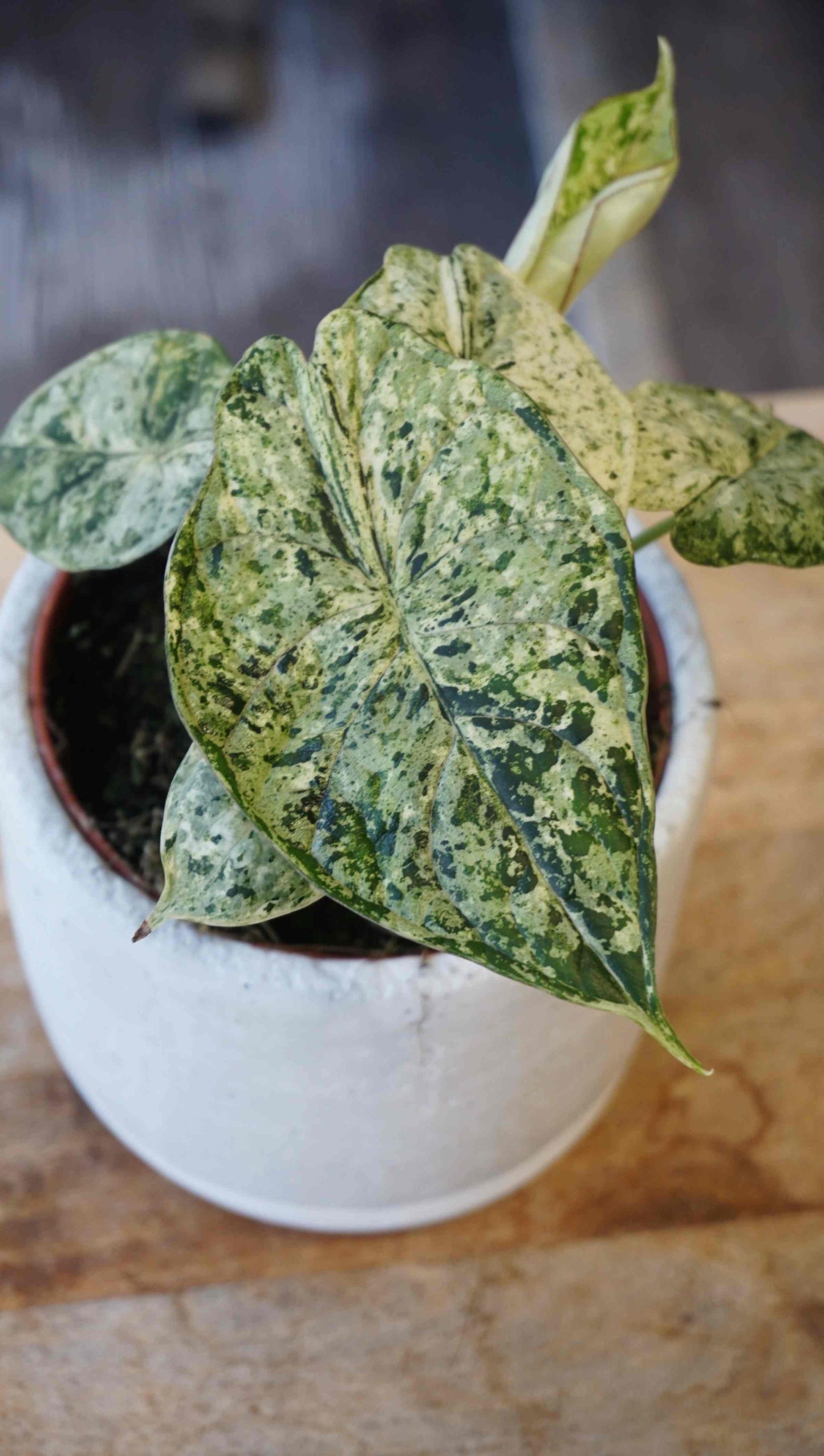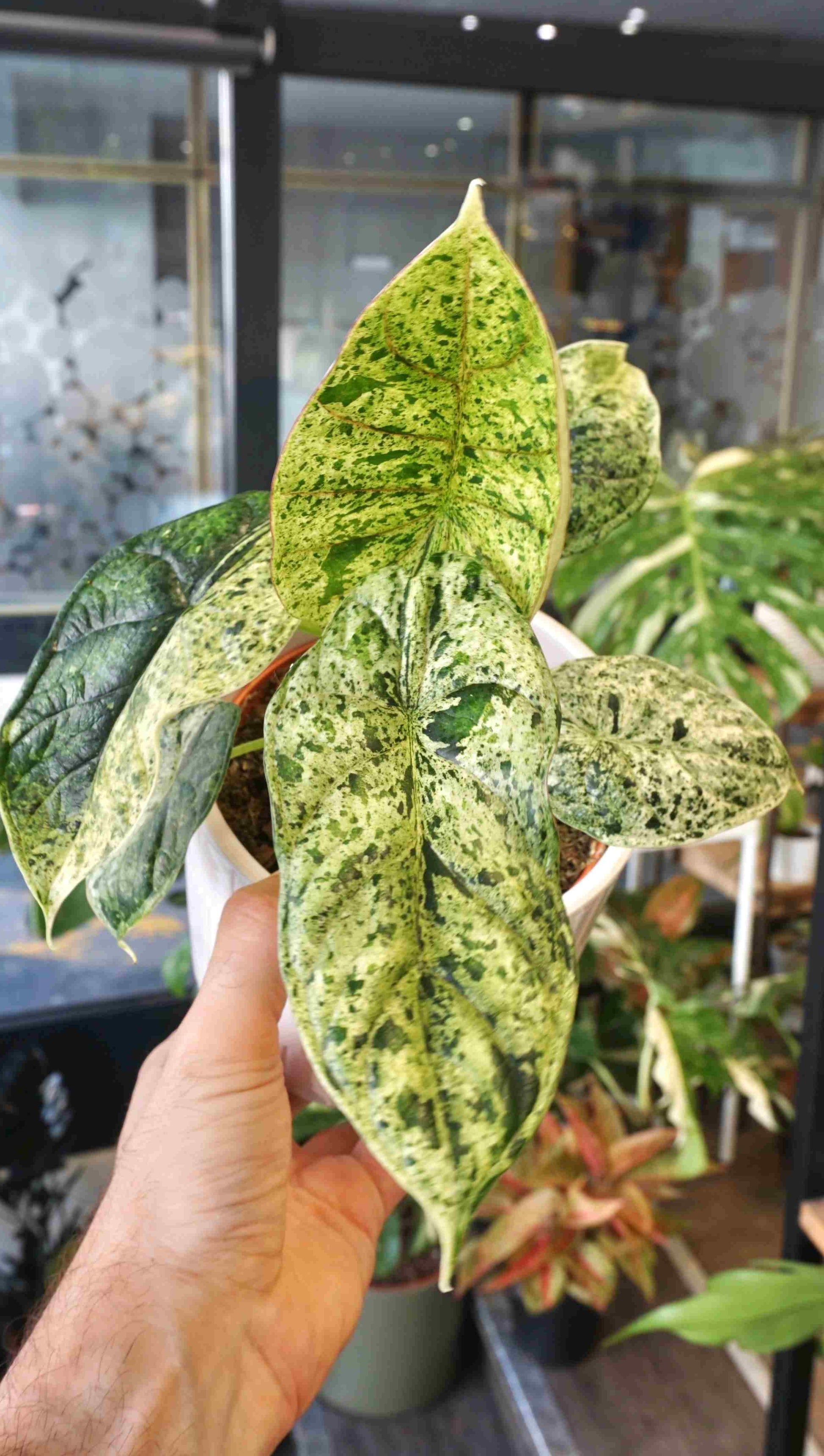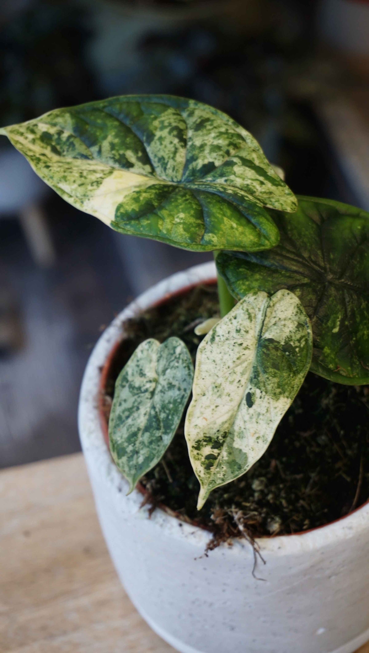 Die Alocasia Dragon Scale Mint ist eine Alocasia mit unglaublichen Blättern, sowohl wegen ihrer ikonischen Form, die an Drachenschuppen erinnert, als auch wegen ihrer zweifarbigen, panaschierten weißen Seite.