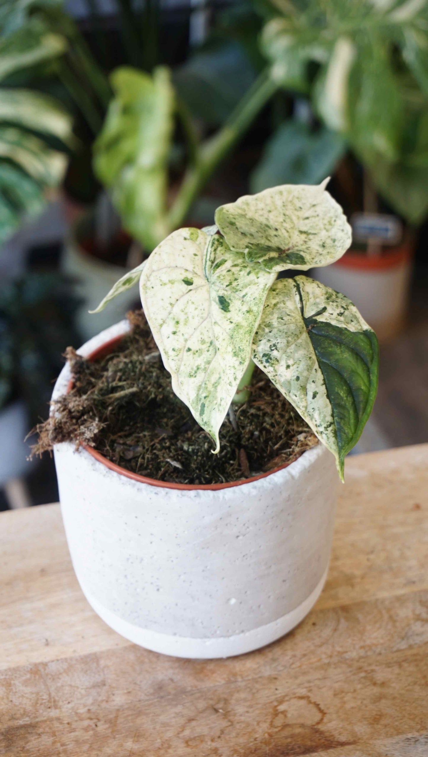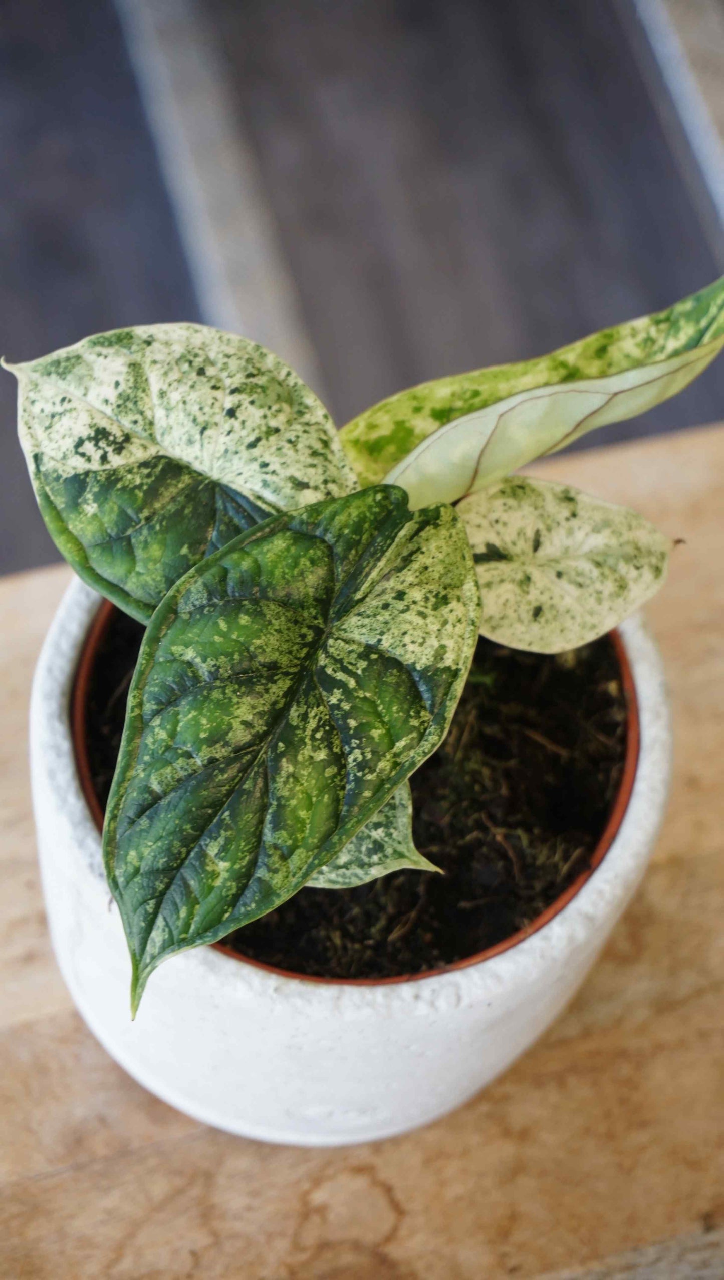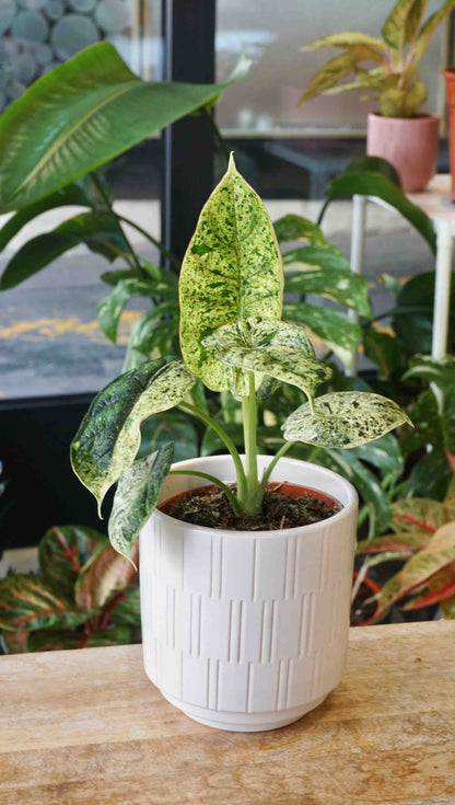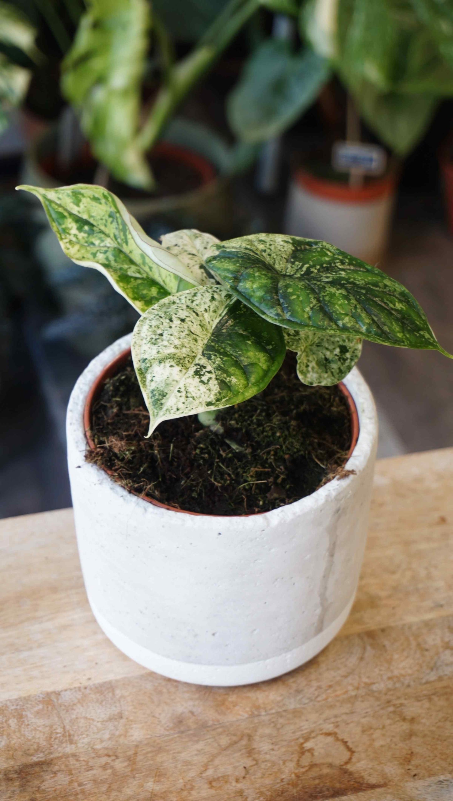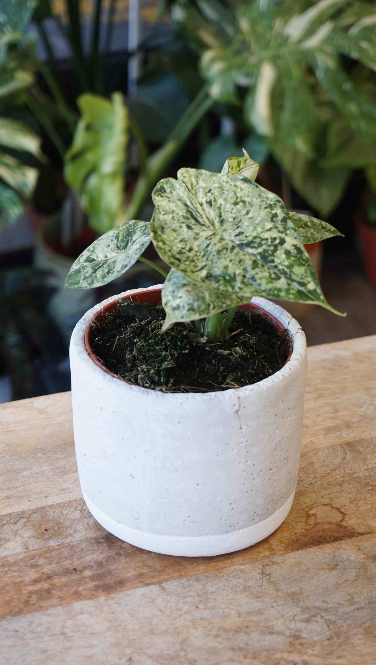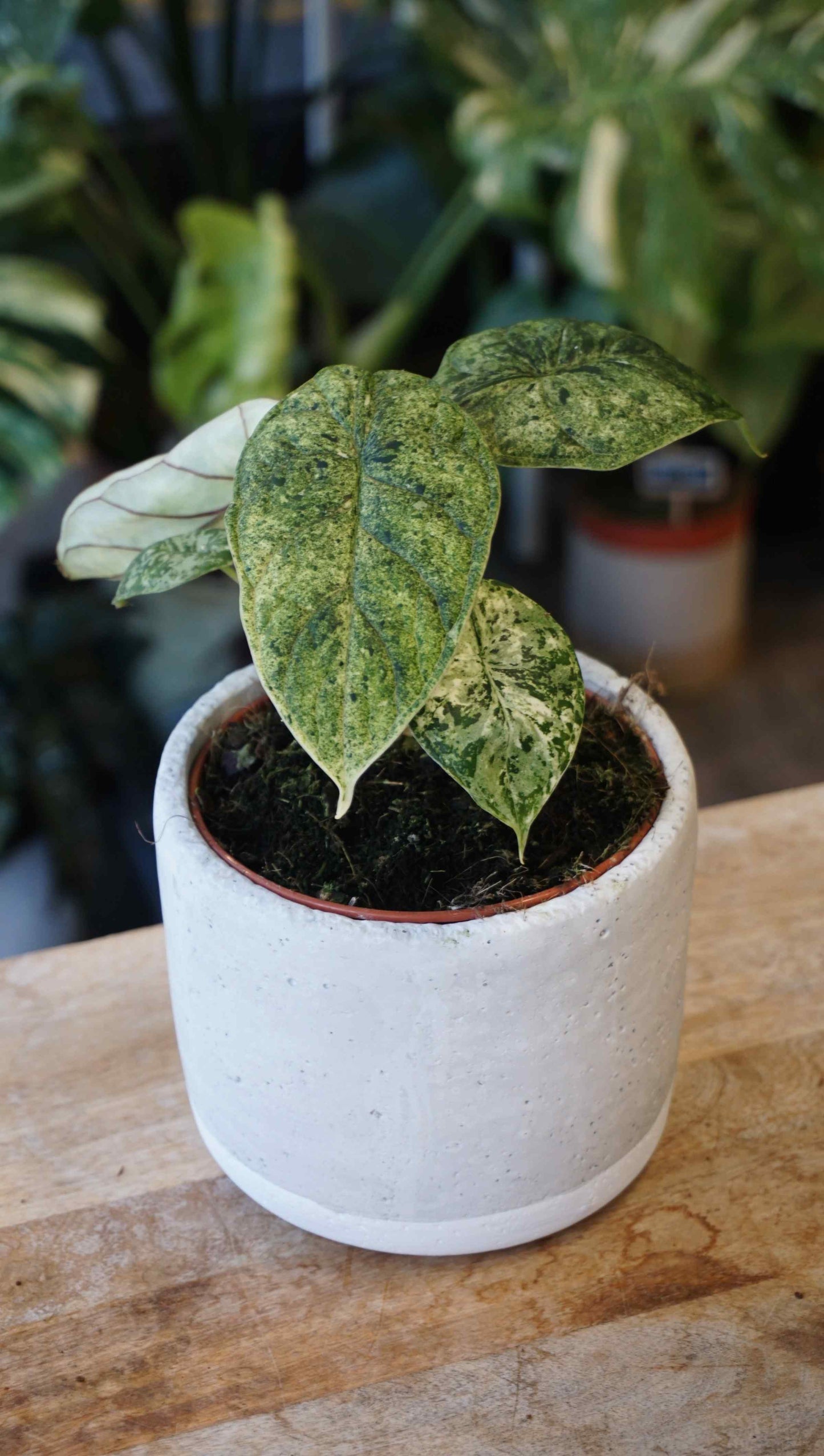 Die Alocasia Dragon Scale Mint ist eine Alocasia mit unglaublichen Blättern, sowohl wegen ihrer ikonischen Form, die an Drachenschuppen erinnert, als auch wegen ihrer zweifarbigen, panaschierten weißen Seite.
