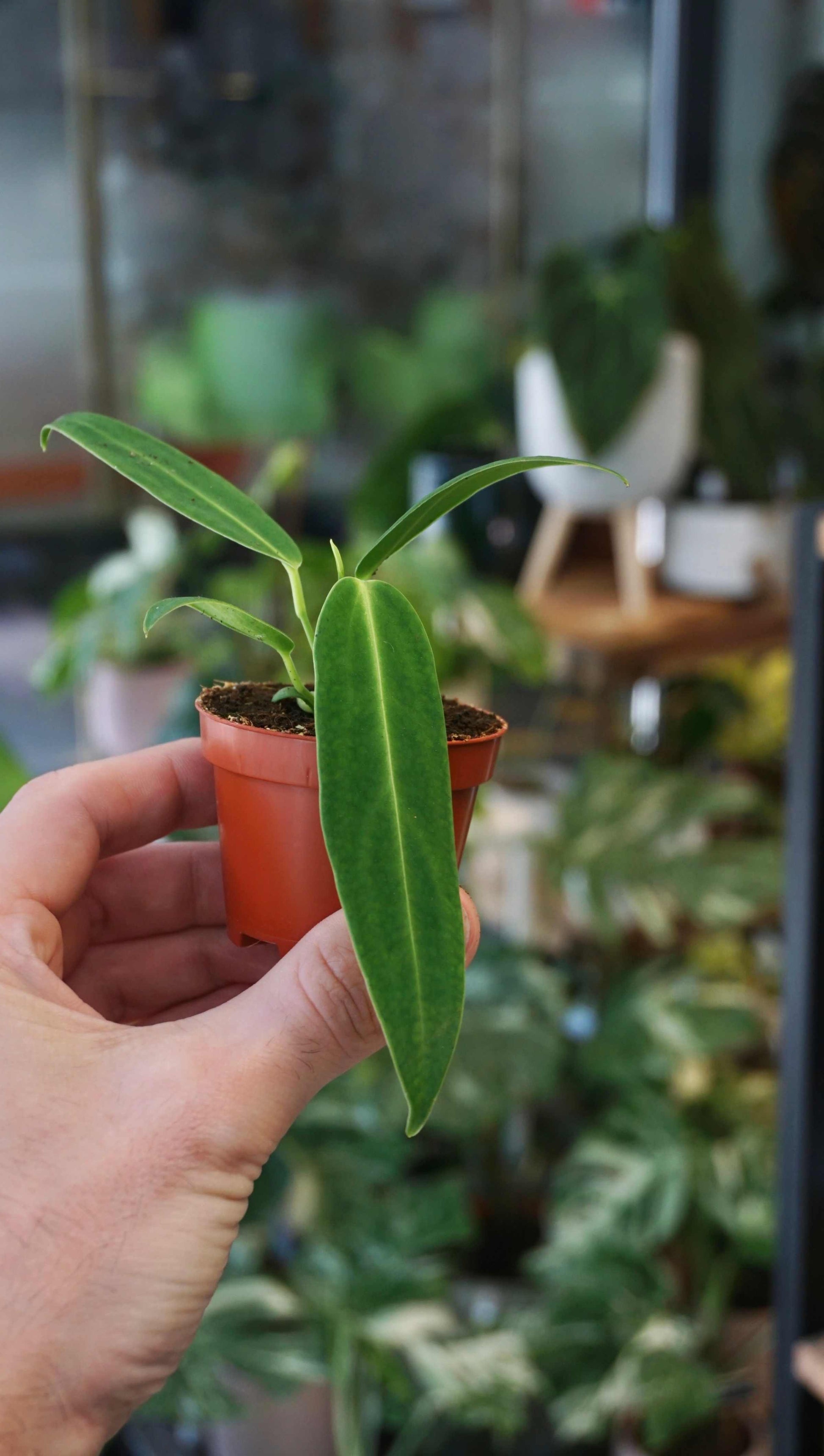 Die Königin der Anthurien, ihre Blätter erreichen im ausgewachsenen Zustand eine Länge von 2 m. Eine sehr elegante Anthurie mit samtigen Blättern und kontrastierenden Adern (im reifen Zustand), einer einfachen und brutal vertikalen Form, ein garantierter Schockeffekt.