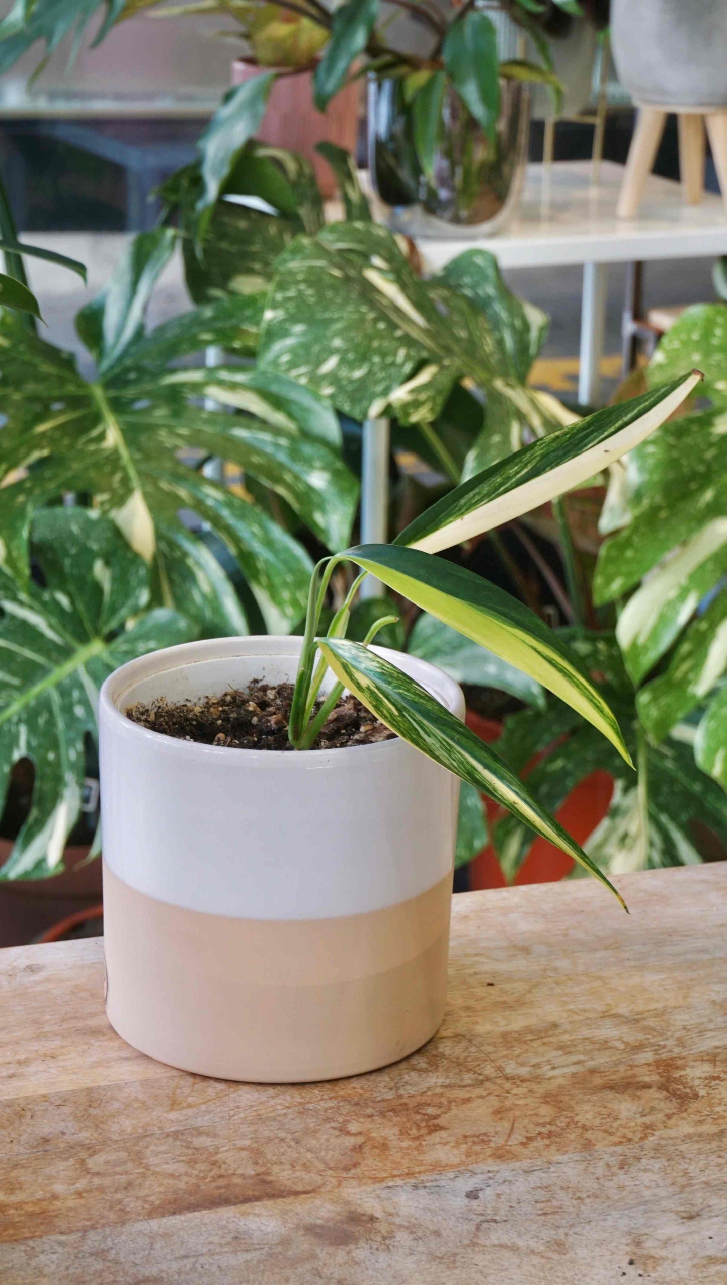 Diese Efeutute ist eine einzigartige Efeutute und mag etwas mehr Licht als ihre Artgenossen. Am besten pflanzt man sie auf einem Torfmoos-Stab, um größere, wunderschöne zweifarbige Pflanzen und längliche Blätter zu entwickeln.