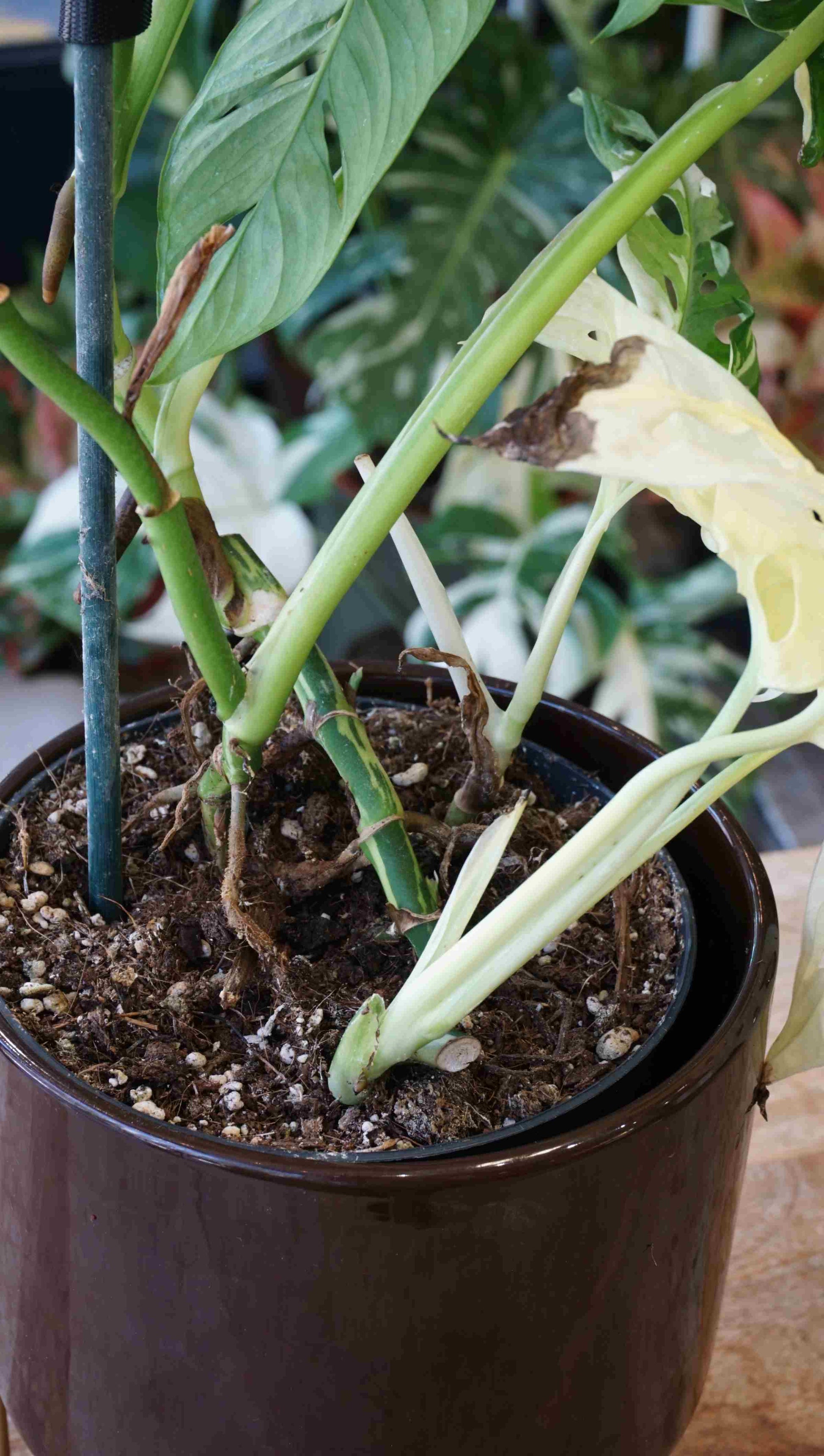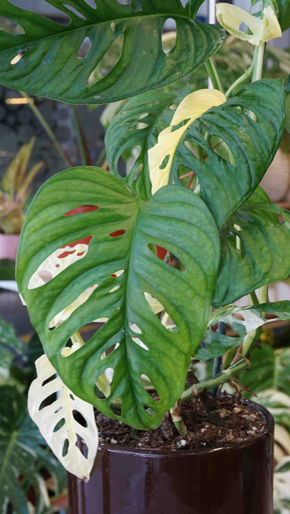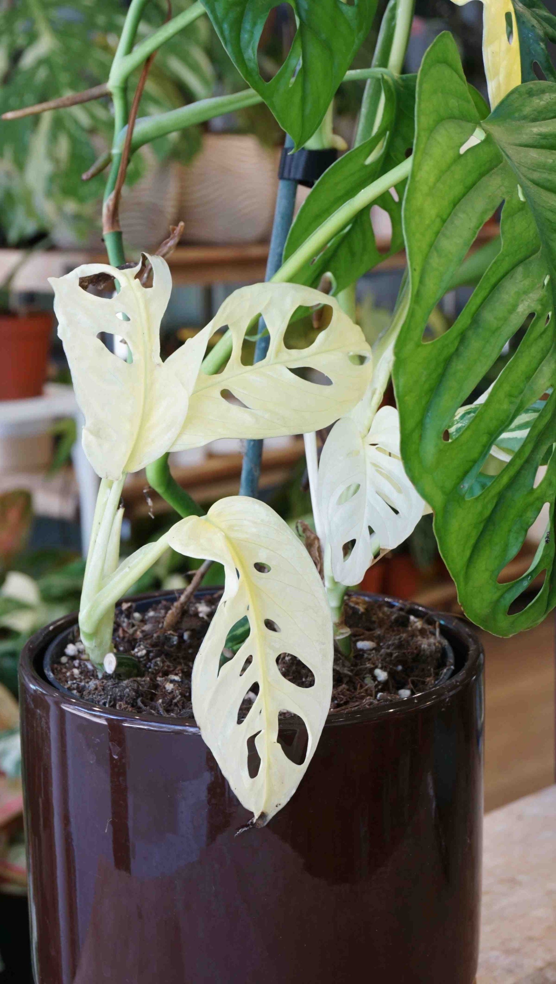 Die japanische Monstera Adansonii Tricolor ist eine Kletterpflanze. Ehrlich gesagt entgeht mir der Unterschied zu einer bunten Adansonii, aber ihre Schönheit ist uns nicht entgangen!