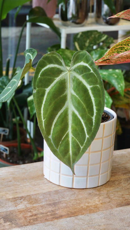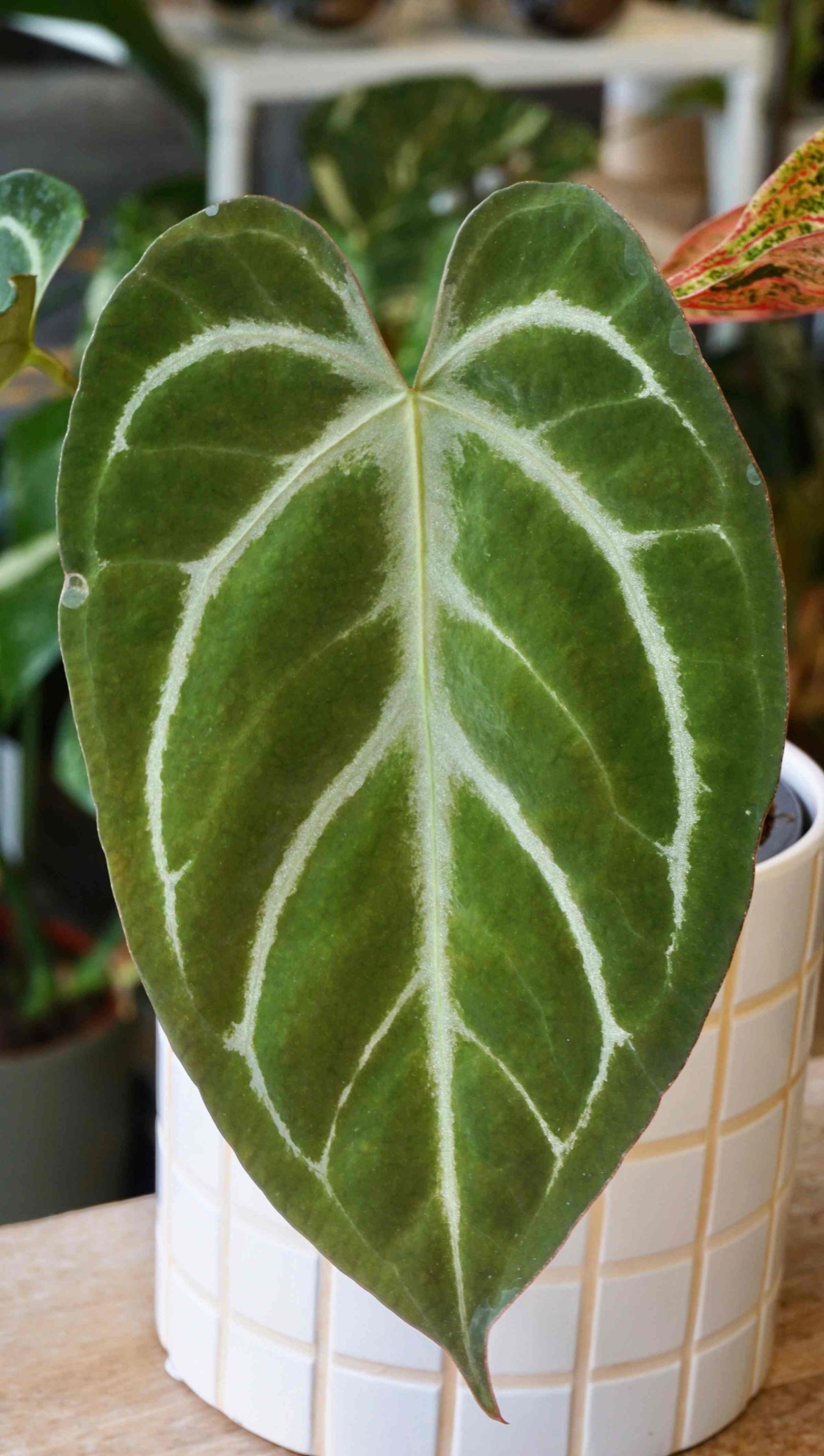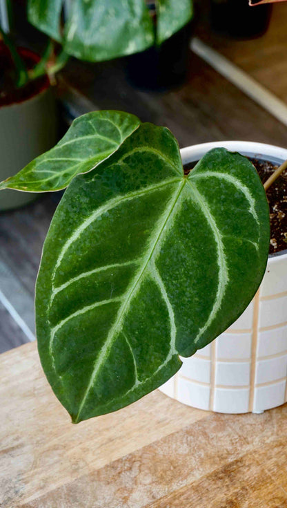 Cet anthurium mystérieux est un véritable coup de coeur. Sa couleur est d'un des plus beaux verts que j'ai vu, et que dire de la forme de ses feuilles, sont petit sinus rouge et ses veines fines minimalistes. Ces anthuriums sont des hybrides mystérieux, à aimer simplement par leur beauté. NOID signifie pas d'identité claire (no identity).