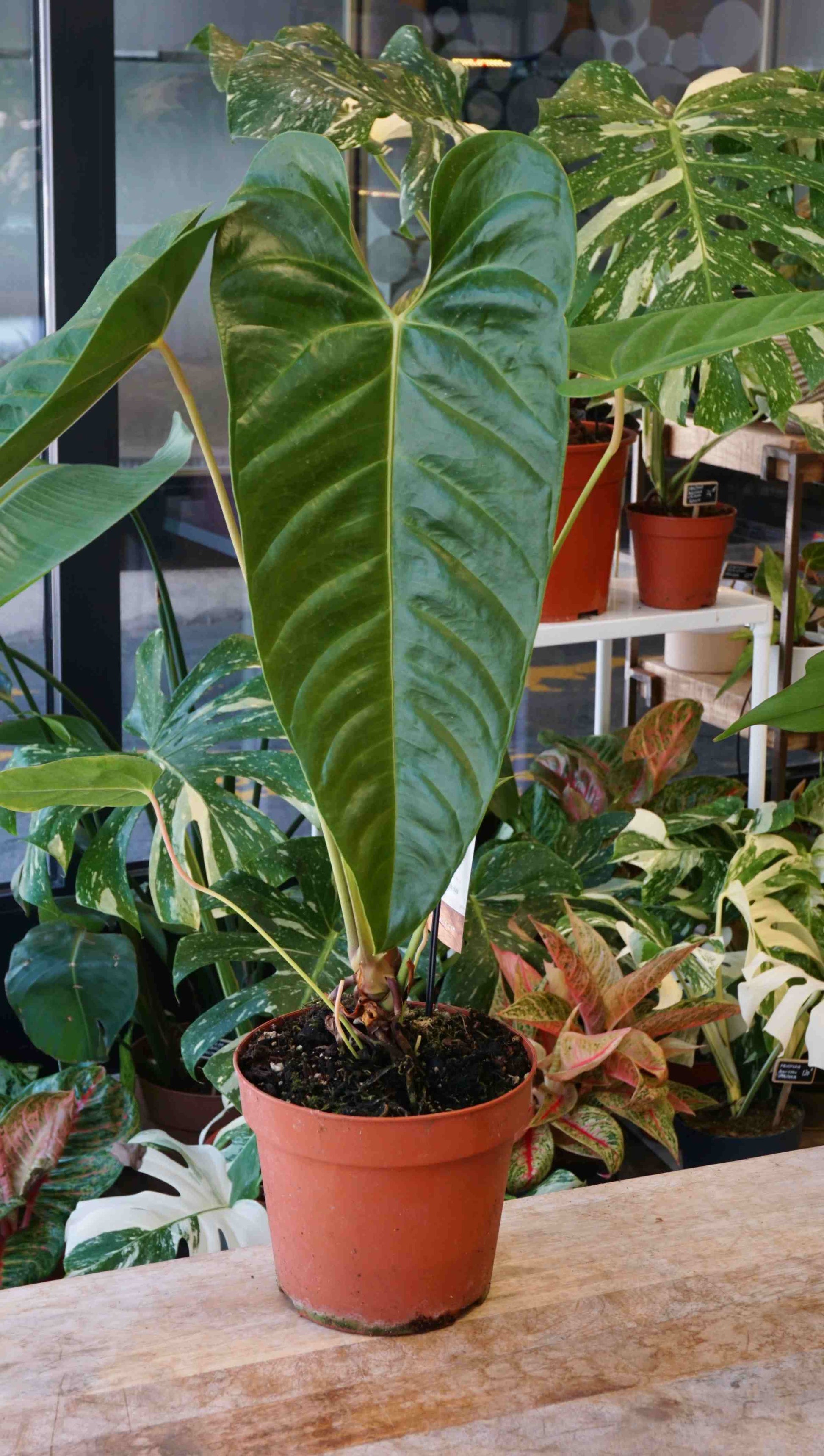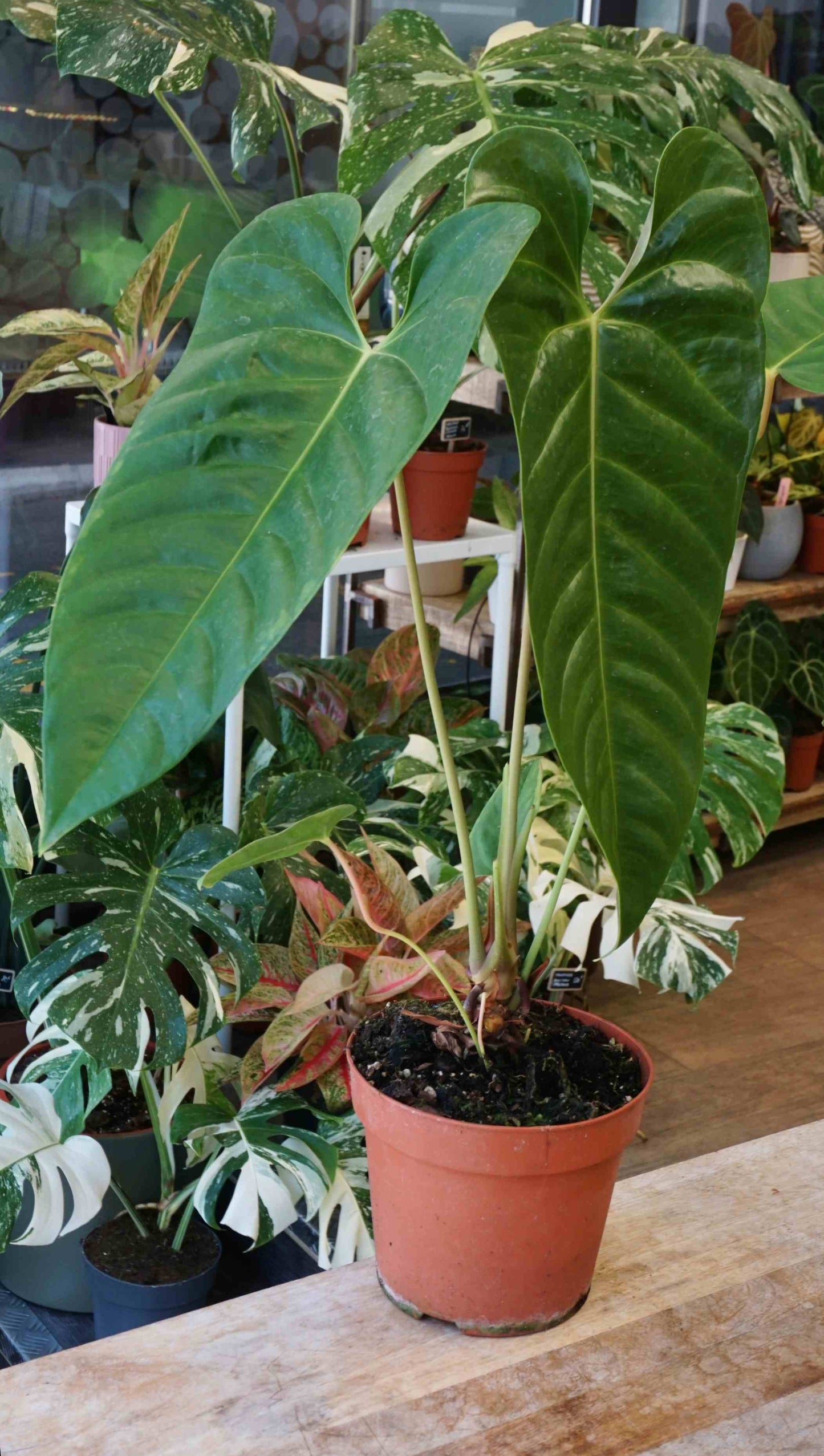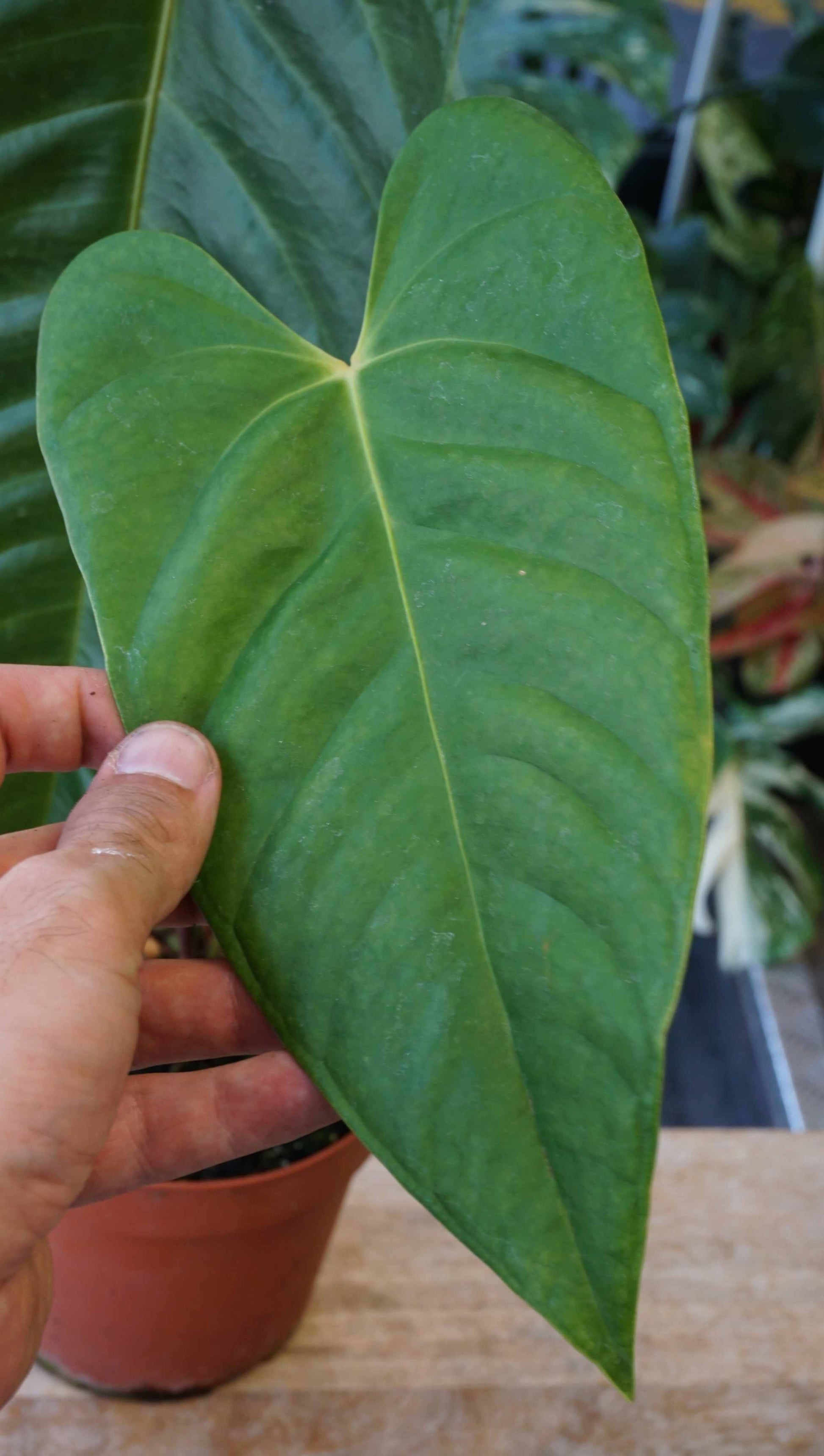 Le Roi des Anthuriums, ses feuilles à maturité atteignent 2m de long. Pour un anthurium, le veitchii est une plante rare très robuste, aux superbes feuilles cottelées qui ressemblent à des abdos. Ce Veitchii en particulier semble avoir une forme différente laissant penser à un hybride. Si je devais deviner je dirais peut être x Esmeraldense